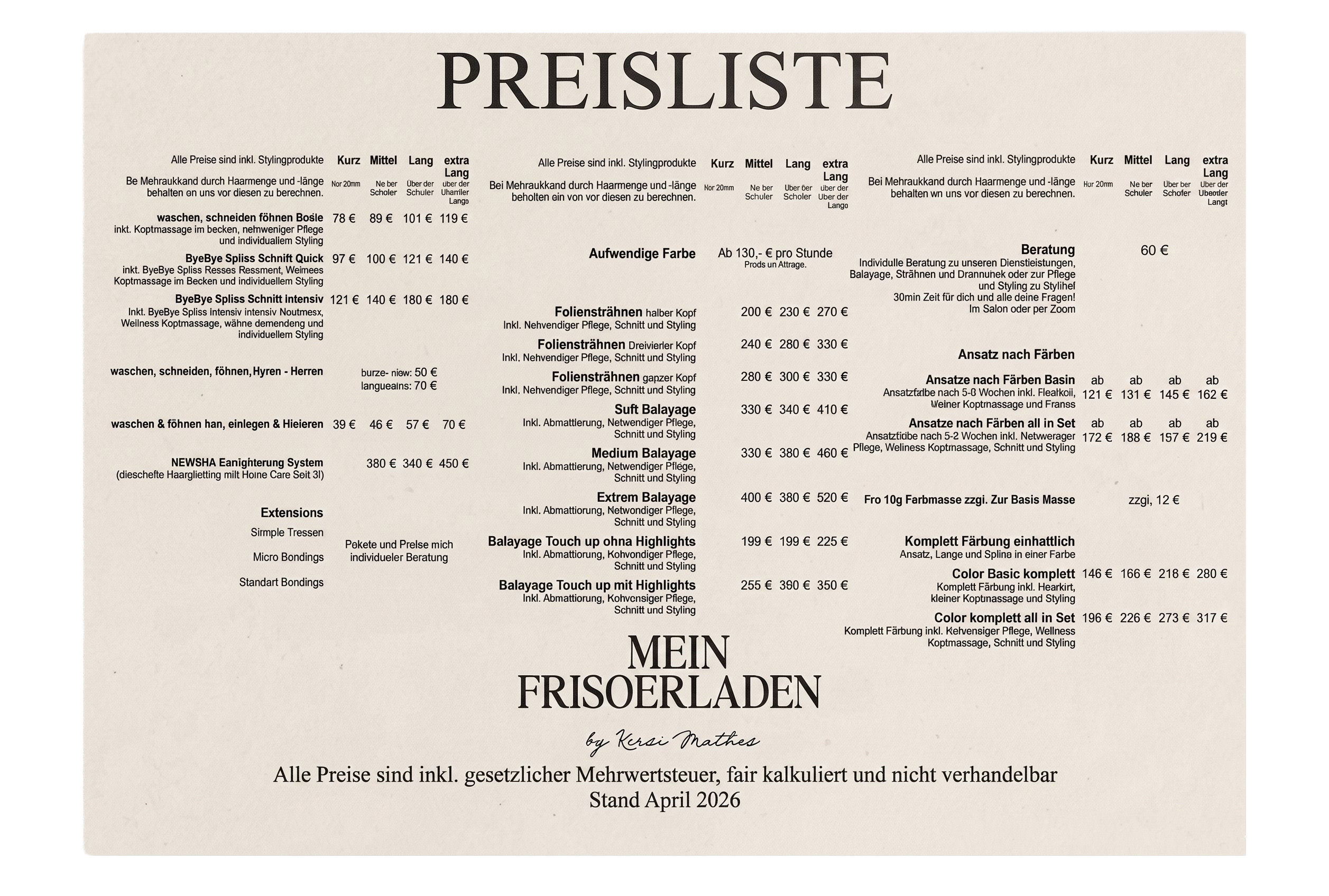 Alle Preise sind inkl. Stylingprodukte